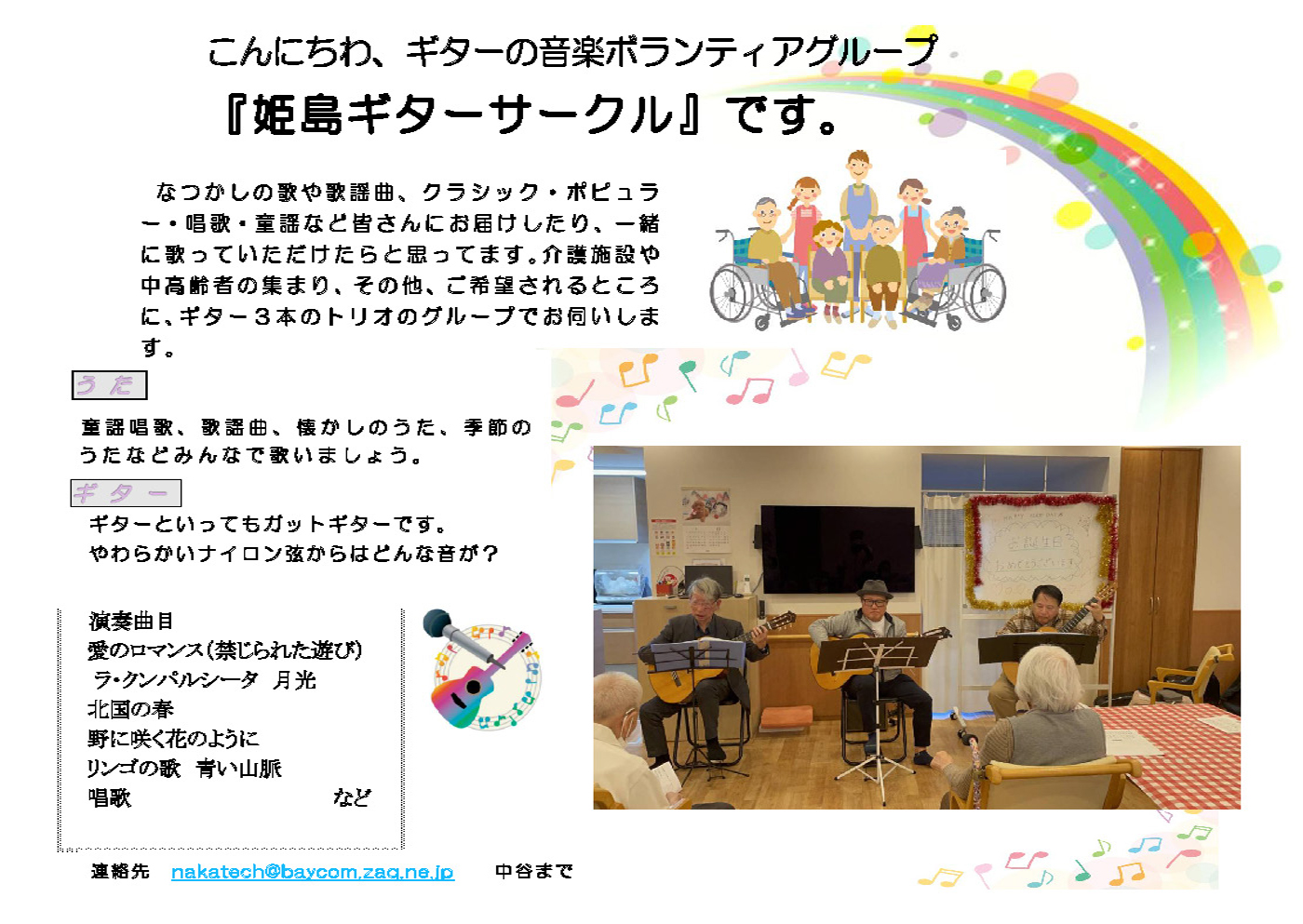 私は音楽活動ボランティアを希望し、社会福祉協議会(ふくふく)を通じてギターの仲間を紹介していただきました。思いもよらず、私の住まいの近くにおられたのでびっくりいたしました。