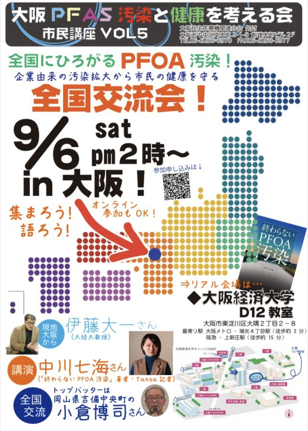 中でも全国一の高濃度汚染地域と報じられた大阪。主要な汚染源の一つがダイキン工業淀川製作所(摂津市)です。ダイキンはPFOA(WHOのランクで「発がん性」物質に指定)を2012年まで半世紀にわたり製造、排液を垂れ流し河川や地下水、土壌、大気を汚染してきました。